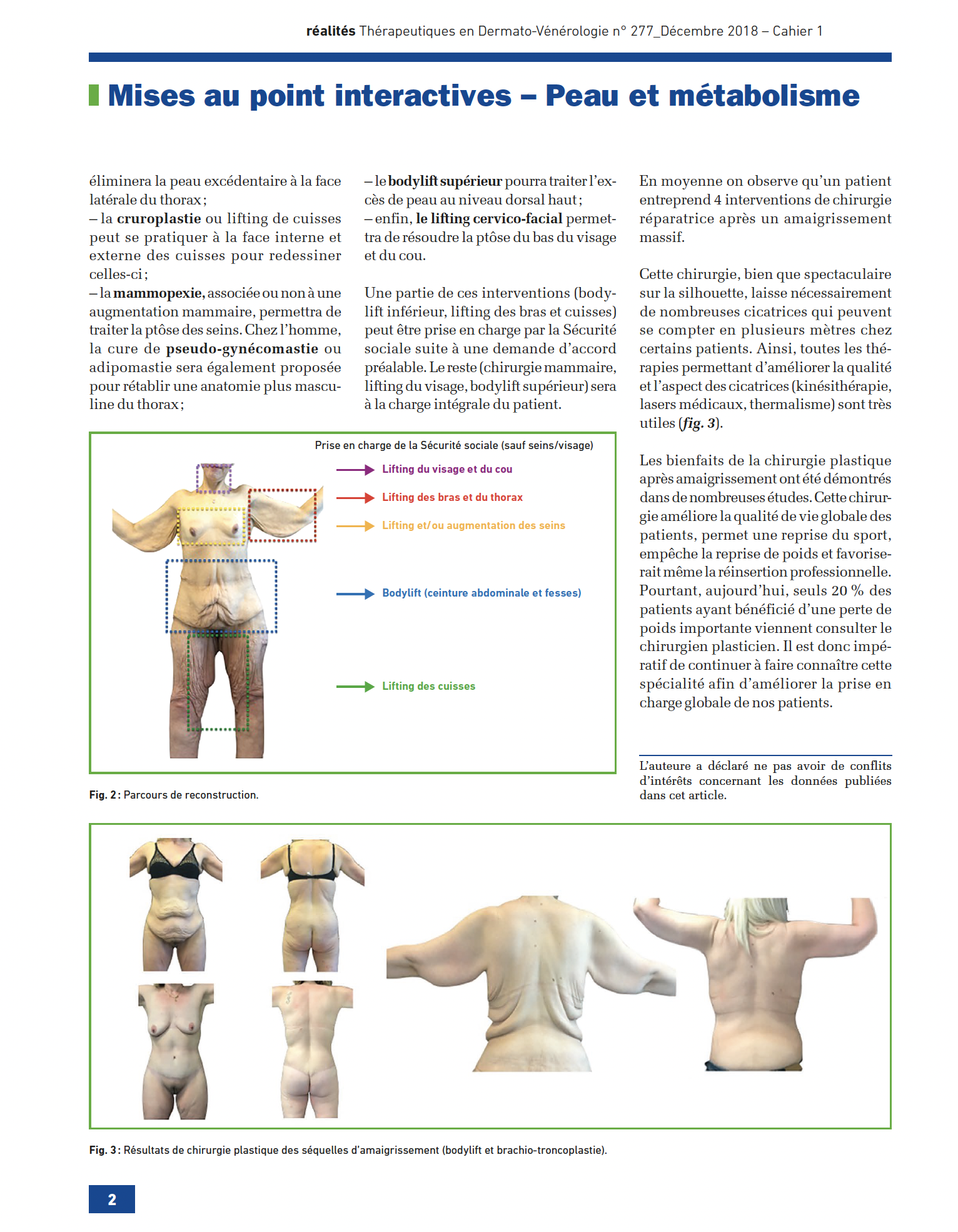 Le Dr Taliah Schmitt décrit dans cet article comment fonctionne la chirurgie plastique des séquelles d’amaigrissement qui a pour but de traiter ces excès de peau importants et ainsi rendre aux patients un corps en harmonie avec leur nouveau poids.